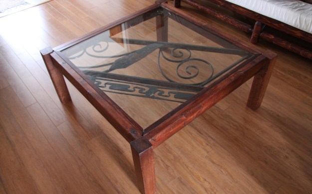 Coffee table which features an old residential railing originally from the Limoilou neighbourhood of Québec where ice skates were made. Notice the skate cutout. Oak legs; pine and spruce frame.