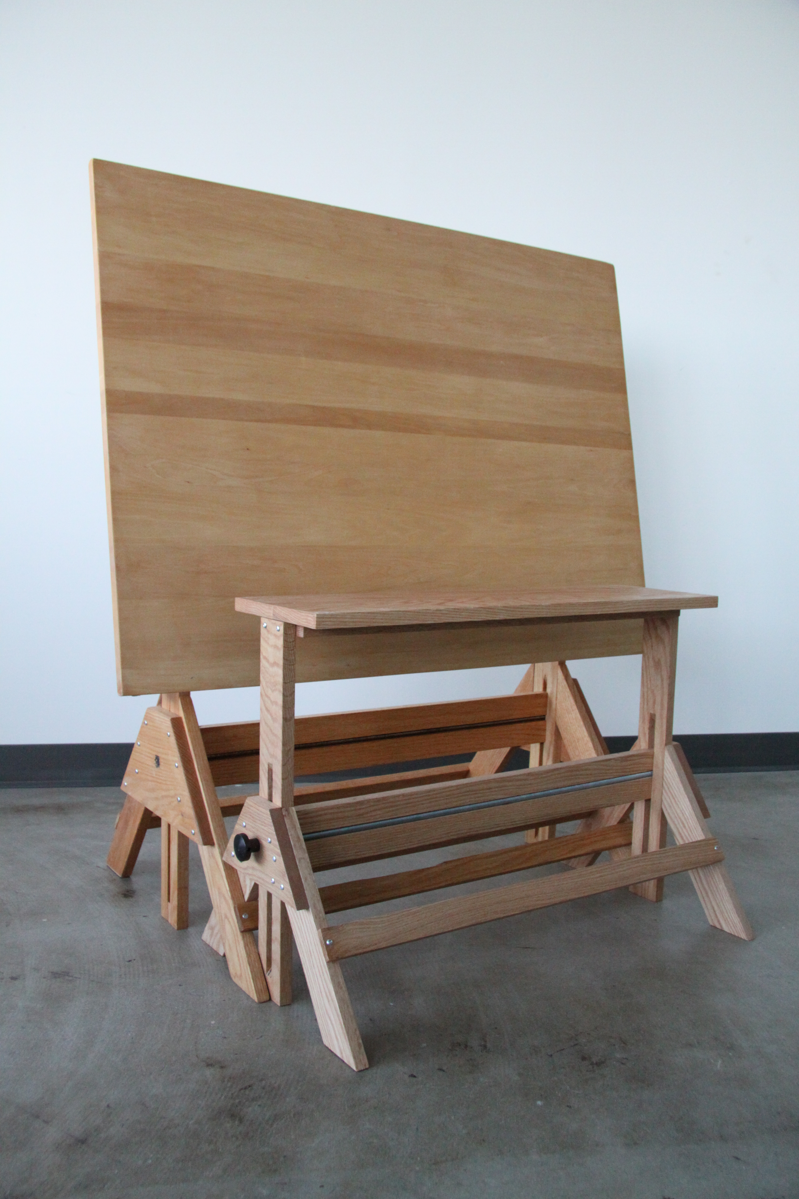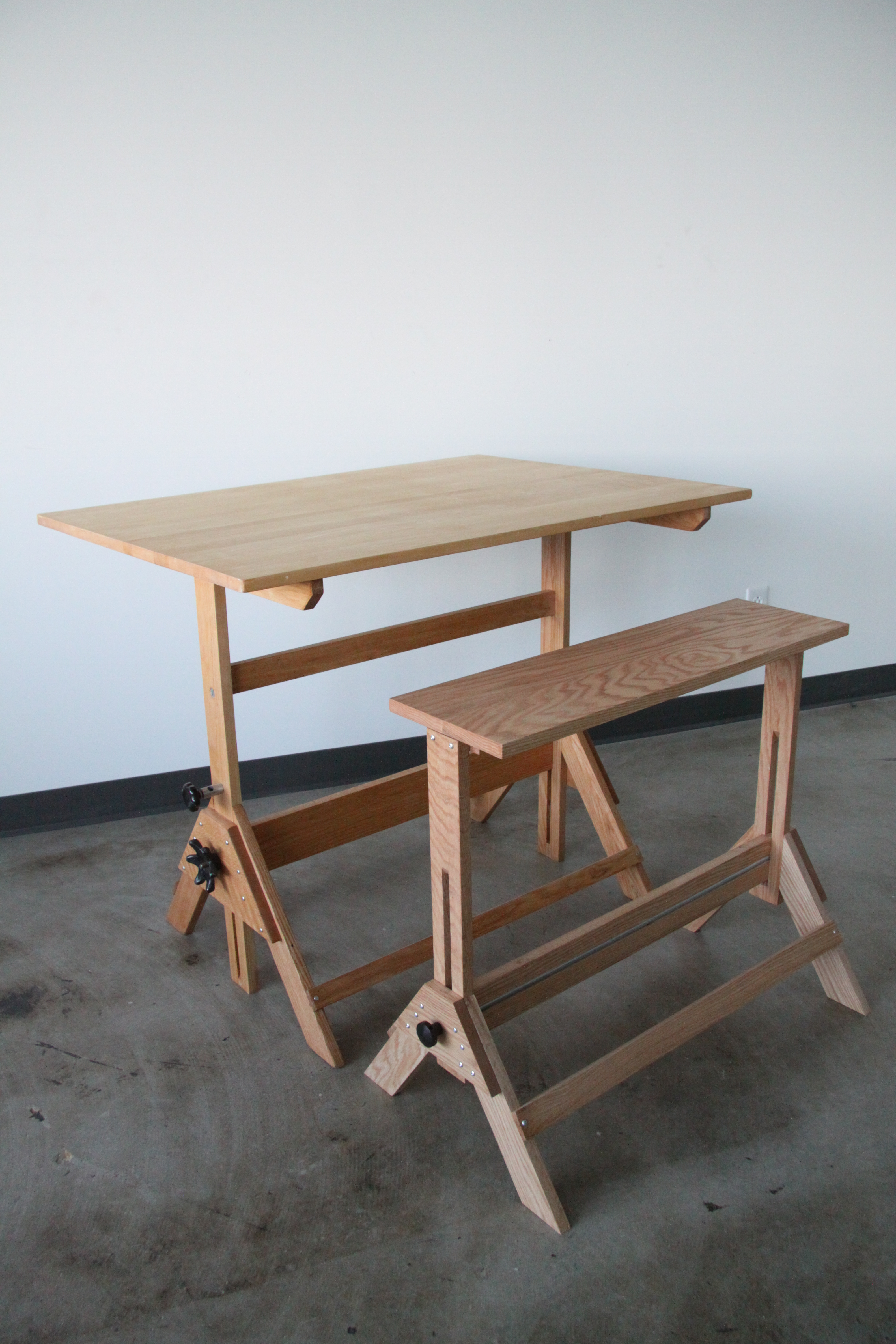 Collapsable and adjustable bench designed to fit collapsable and adjustable drafting table. Offers a variety of work surface settings as well as the park bench function. Made of solid red oak.